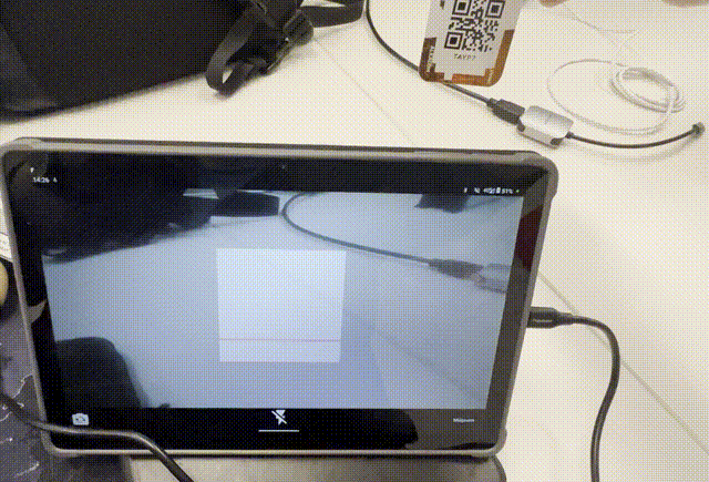 Megjelenik a QR-kód olvasó. A tablet kamerája a jobb felső sarokban található — tartsd mögé a kártyádat a kód beolvasásához.